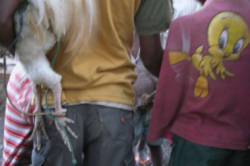 The men of the village place their bets for a cockfight that begins before dark. (Photo by Maria Bakkalapulo)