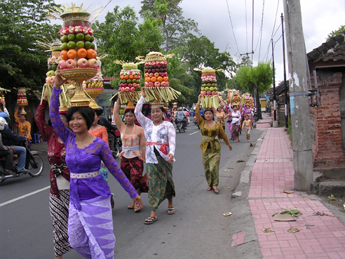 (at the temple) Wow, this is incredible. Outside the temple thereís a procession of women. Hundreds of women.. in sarongs, lace tops and sashes. Really colorfully dressed. With these towering offerings on their heads. I would say they are about an average of a meter high. And the colors are just spectacular. We have mangos, lemons, oranges and cakes. Today is a very special day in Bali. It is Tumpek Wayang, which is a celebration of the arts in Bali. Music, theater, and most importantly, wayang kulit, or shadow puppet theater